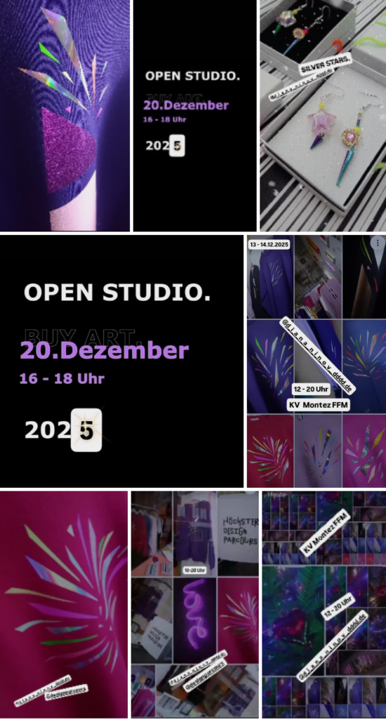 „Eng an eng stehen die etwa ein Dutzend Besucher in dem kleinen Raum Nummer 3.02. Grelle, neonfarbene Striche, Rechtecke und Zeichnungen an den Wänden und dem Boden wirken raumeinnehmend. Der Kontrast beim Blick aus dem Fenster im dritten Stock auf die Hanauer Landstraße könnte an diesem grauen Novembertag kaum größer sein. Als das Licht gelöscht wird, leuchten die farbigen Kunstwerke von Diana Ninov noch kräftiger. Die Kommunikationsdesignerin hat am Samstagnachmittag im „Atelier Frankfurt“ neben mehr als 200 weiteren Künstlern ihren Werkraum für Besuch geöffnet. „Hessens größtes Kunstzentrum“, das seit vier Jahren in der Schwedlerstraße 1 – 5 beheimatet ist, hat am Wochenende zu den „Open Studios“ geladen. … „